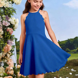 فستان قصير صيفي غير رسمي للفتيات بياقة دائرية وياقة سكالوب بحافة رقبة مستديرة بدون أكمام تصميم ضيق بحافة مضيئة صلبة على شكل حرف A-line