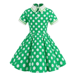 فستان أنيق أنيق للفتيات بنمط كلاسيكي وأطري وأطلية بولكا دوت غربية بأكمام قصيرة