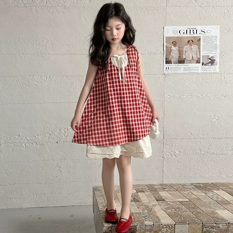 ชุดเดรสสำหรับเด็กสไตล์เกาหลีสำหรับเด็กผู้หญิง2-10คนใหม่ฤดูร้อนเดรสลูกไม้ลายตารางแขนกุดลายสก๊อตแสนสวยสำหรับเด็ก2-10คน