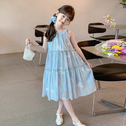 เดรสผ้ายีนส์สำหรับเด็ก2025มีสไตล์ฤดูร้อนชุดเดรสลำลองคอกลมลายดอกไม้หรูหราสไตล์เกาหลี